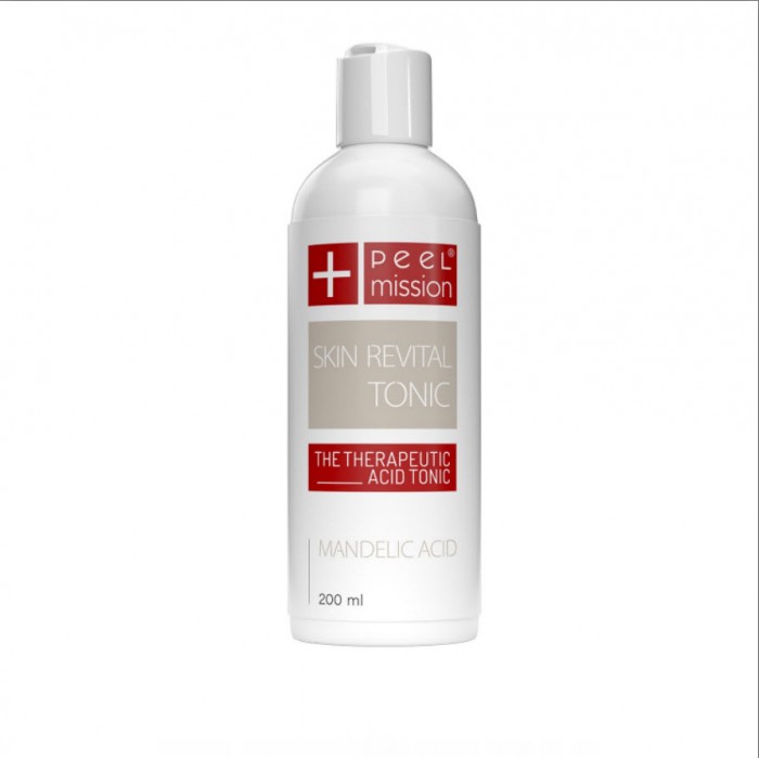 Терапевтичен Тоник с бадемова киселина от Peel Mission SkinRevital tonic The therapeutic acid tonicПРИЗНАЦИ: кожа с признаци на стареене, чувствителна кожа, избелващо действие, акне,себореяУПОТРЕБА: Два пъти дневно. Нанася се с напоени тампони на чиста, подсушена кожаАктивен състав:БАДЕМОВА КИСЕЛИНА – принадлежи към групата на алфа-хидроксилните киселини (AHA) с ексфолиращи, антибактериални и анти-стареещи свойства. Отличава се със силно антибактериално и дезинфекциращо Това е киселина с двойно действие,от една страна, той регулира обновяването на клетките, като ексфолира горните слоеве на епидермиса, като по този начин подобрява структурата и цвета на кожата и има ефект против бръчки, от друга страна, има силен антибактериален ефект, благодарение на който успокоява кожните възпаления, лекува възпаления и акне лезии. Това е AHA киселина, която стимулира производството на хиалуронова киселина в кожата. ЛАВАНДУЛОВ ХИДРОЛАТ – Широко известен е със своите лечебни, успокояващи, успокояващи, антибактериални и антисептични свойства. Благодарение на това помага на кожата да се регенерира. Свойствата си дължи на съдържанието на производни на полифенола (розмаринова киселина), тритерпеник (урсолова киселина) и горчивина (пикросалвин, карнозол). Етеричното масло от лавандула също има релаксиращ и релаксиращ ефект благодарение на минималните количества етерично маслоНИАЦИНАМИД – форма на витамин. B3 се абсорбира лесно от кожата и се понася добре. Той стимулира производството на кожни липидни компоненти (главно серамиди) и прекурсори на съставки, отговорни за поддържането на правилната хидратация на кожата (кератин, инволюкрин, филагрин), благодарение на което видимо подобрява епидермалната липидна бариера, кожата става по-устойчива на външни фактори и по-добре овлажнена.ПАНТЕНОЛ – намалява загубата на вода през епидермиса и ефективно овлажнява кожата, като я прави мека и еластична, стимулира клетъчното делене, благодарение на което тя регенерира, подобрява епидермалната липидна бариера. АЛАНТОИН – успокоява кожните раздразнения, причинени от препарати и регенерира кожатаПрофесионална домашна грижа от ЕВА център за красота